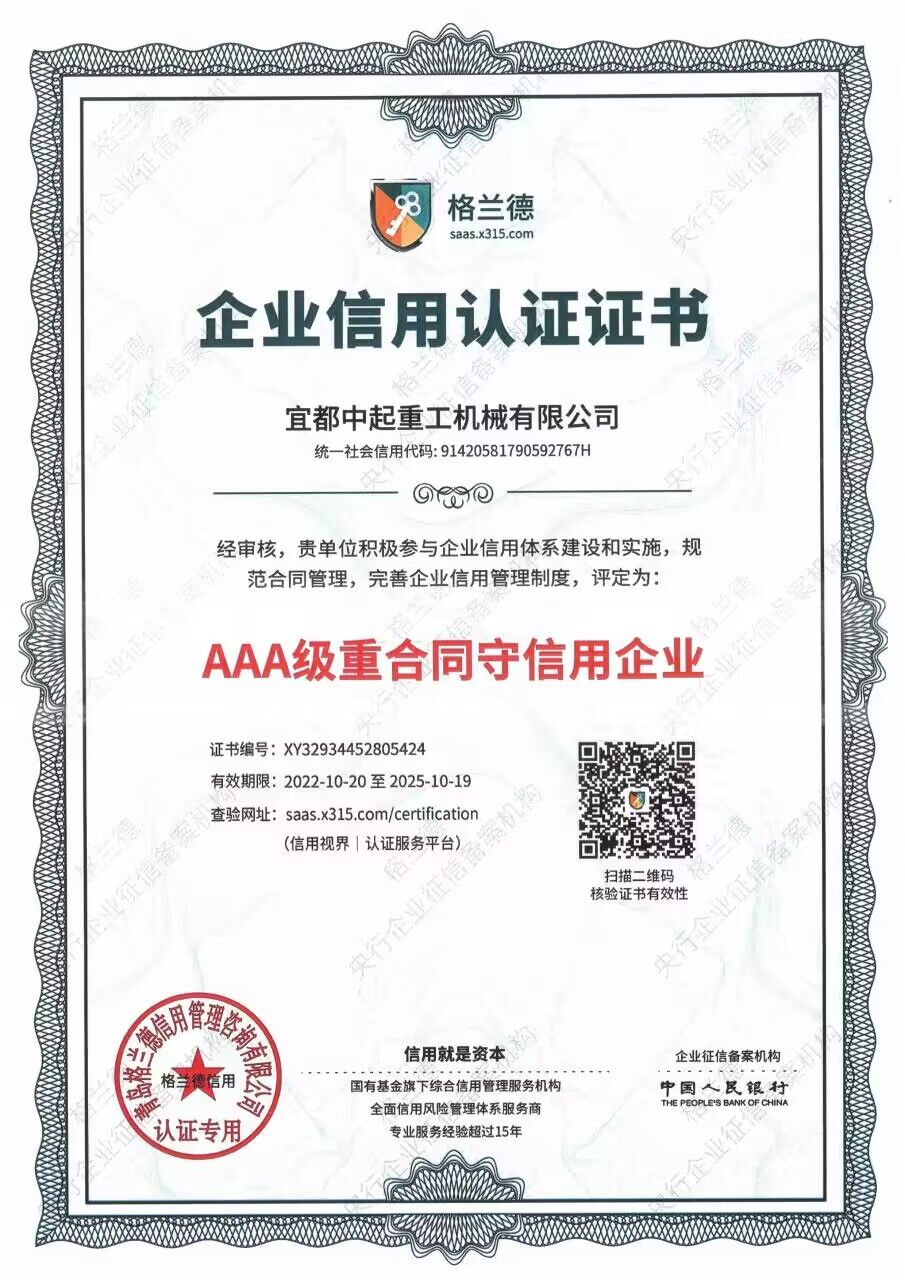 2022年宜都中起重工機(jī)械有限公司被信用視界評(píng)為AAA級(jí)重合同守信用企業(yè)。